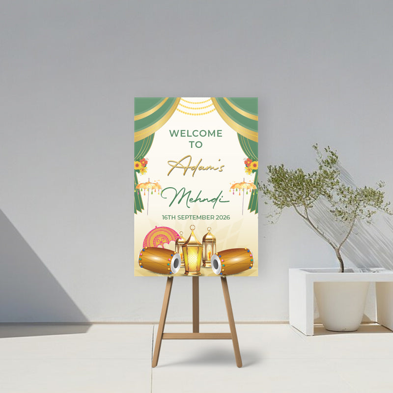 - Add a personalised touch to your wedding celebration with our green and gold mehndi welcome board